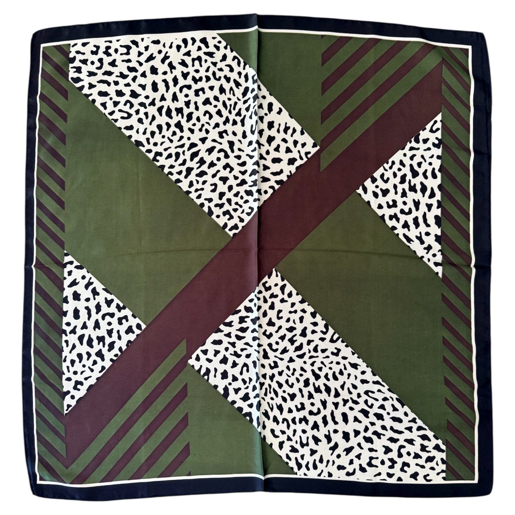 Sassy Square Block Scarf in a very attractive print that includes the always popular animal leopard print, grounded on a bed of deep olive and chocolate brown panels. Very stylish and really suited to to the warm deep skin tones.