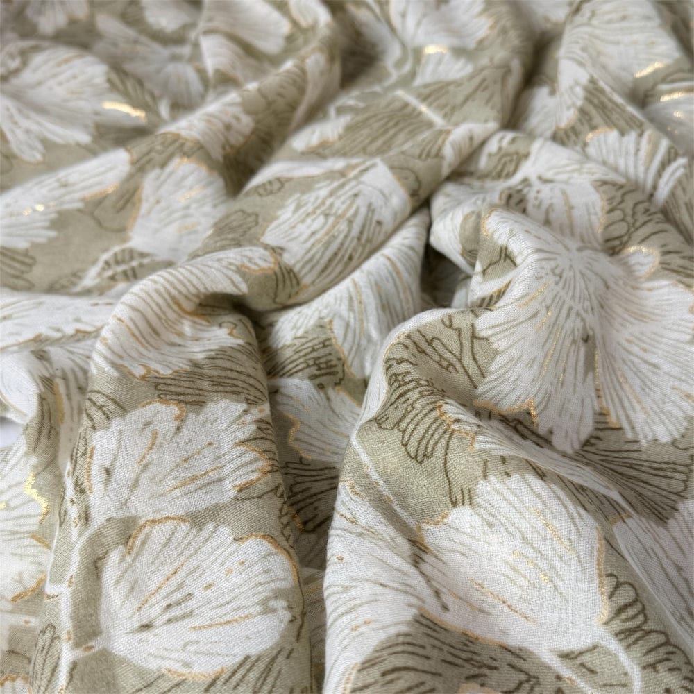 Imagine a sun-drenched afternoon stroll through a blooming park or a gentle seaside breeze at your favourite beach retreat. Draped effortlessly around your shoulders, this generously -sized print scarf brings a touch of sophistication to your ensemble, perfectly complementing the fresh tones of spring and summer. Its delicate leaf print intertwined with subtle gold foil threading catches the light, creating an air of understated elegance wherever you go.